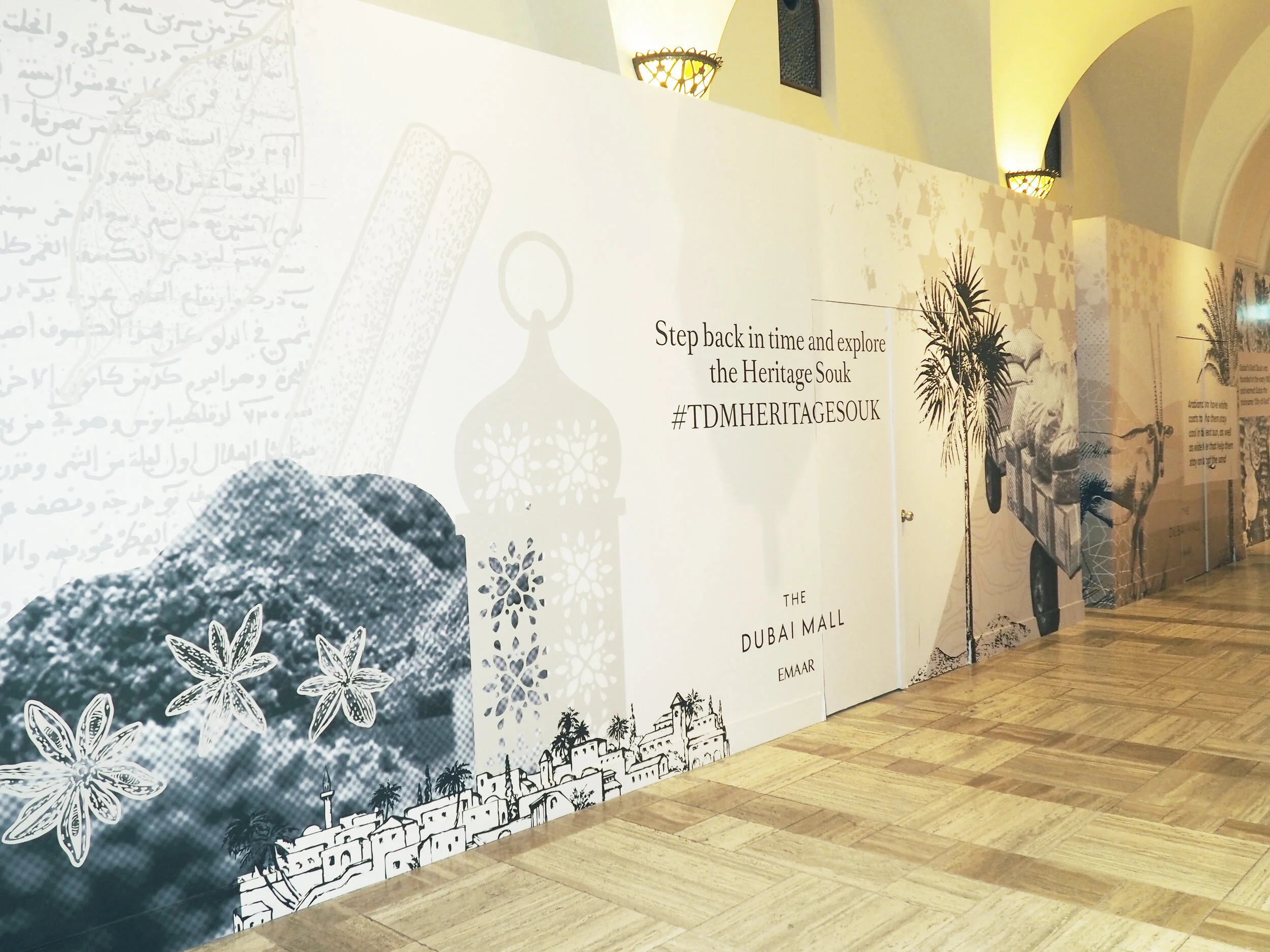 The hoardings had to be bespoke to suit this more traditional area of the mall. We developed the concept of the ‘Heritage Souk’, which combined a mixed medium of imagery, graphics, textures and facts from the region.